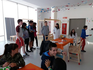 Las monitoras distribuyeron  al alumnado en 5 grupos con kits de materiales de nanotecnologia y les propusieron retos o invenciones que con ayuda de demostraciones prácticas y pistas tenían que superar.